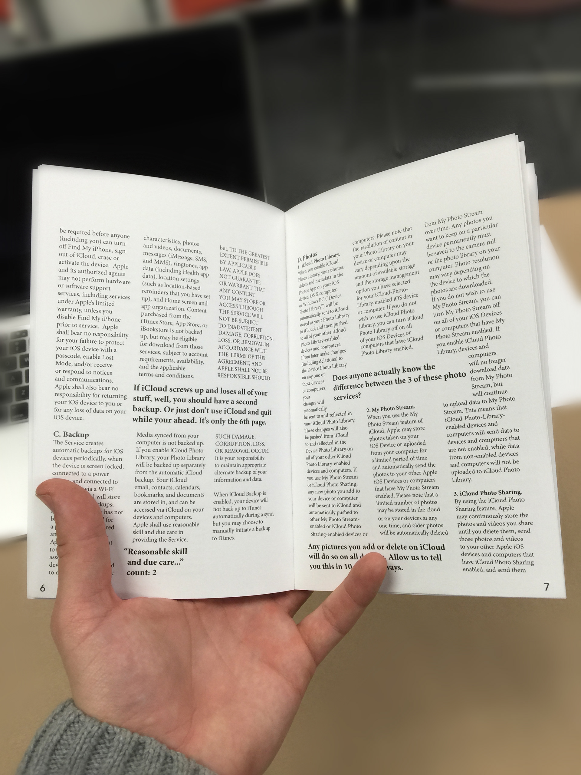 One of the most ubiquitous and perhaps overlooked agreements we make is to the End-User License Agreement. Virtually everyone who has ever owned a piece of technology has knowingly or not, agreed to one. For this project my task was to interpret and re-design the EULA for optimal user experience and information in a print format.